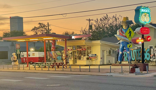 Buck’s On 66: Buck Atom’s Cosmic Curios has been a popular stop on Route 66 since the 1960s. The eclectic shop is housed in a former 1950s gas station on a prominent corner on Route 66 (11th Street) and Quincy in the Pearl District. In addition to a whimsical variety of Route 66 items in the small store, it features two of the giant statues on the grounds. To the right of the store stands the 21-foot-tall ‘Space Cowboy’ named Buck Atoms, while to the left of the store stands a 19-foot-tall ‘Space Cowgirl’ named Stella Atoms statute. There are many photo opportunities around the facility adding to its popularity. Photo by Gary Warren/ladailypost.com