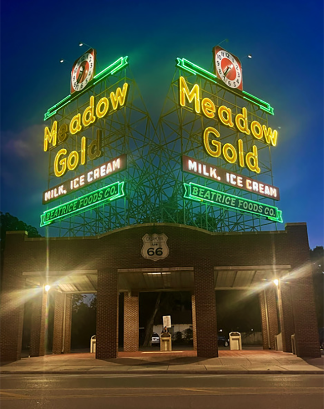 Meadow Gold: Meadow Gold Dairy has been around since 1901 serving a variety of dairy products. The Meadow Gold sign was constructed in 1934 as an advertisement for Meadow Gold, which was owned by Beatrice Foods Co. at that time. The sign glowed in the Tulsa sky until the 1990s and the building that it sat on was sold and demolished in 2004. However, the Tulsa Foundation for Architecture was able to disassemble the sign and save it. The sign was moved to this structure built solely to display the sign again. The sign was installed on the structure on 11th Street in 2016 where it once again lights the Tulsa sky. The clocks on top were added at a later date. As you can see the neon lettering was not complete the evening that we visited the area. Meadow Gold is now owned by a cooperative of farmers who continue to produce quality dairy products. Photo by Gary Warren/ladailypost.com