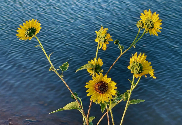 Sunflowers: Following a day of driving and touring sites on Route 66 in Oklahoma, we found the El Reno RV Park at Lake El Reno, Okla. This is another site that was part of a city park just outside of town, which offered many activities for locals but also had a nice RV park for visitors. While walking the trails around the lake, I spotted these sunflowers growing on the banks lit brightly by the late afternoon sunlight. I had anticipated photographing the flowers as I looked across the lake, but when I got closer the obvious choice was to look down at the sunflowers with the dark blue water of the lake serving as the background. Photo by Gary Warren/ladailypost.com