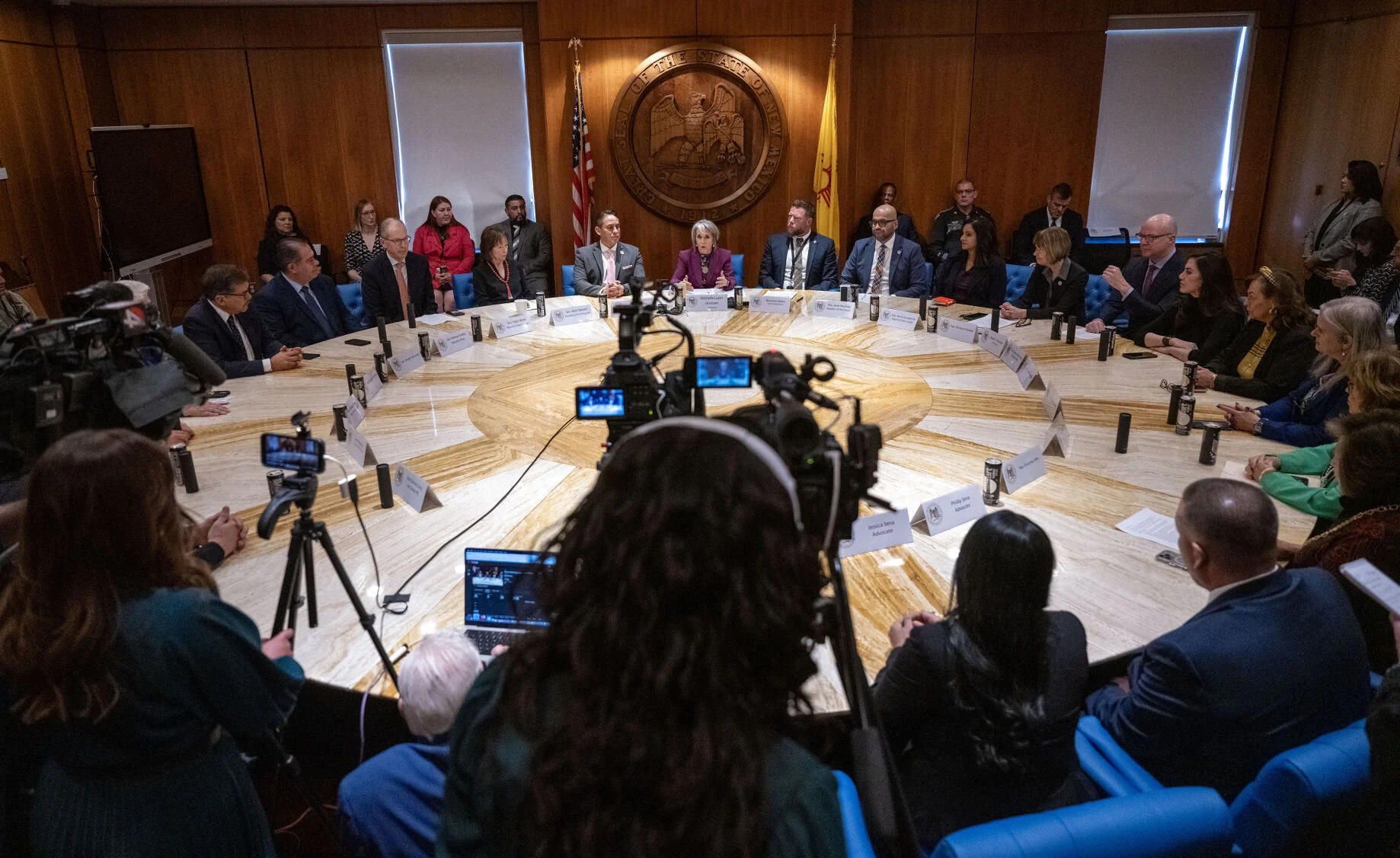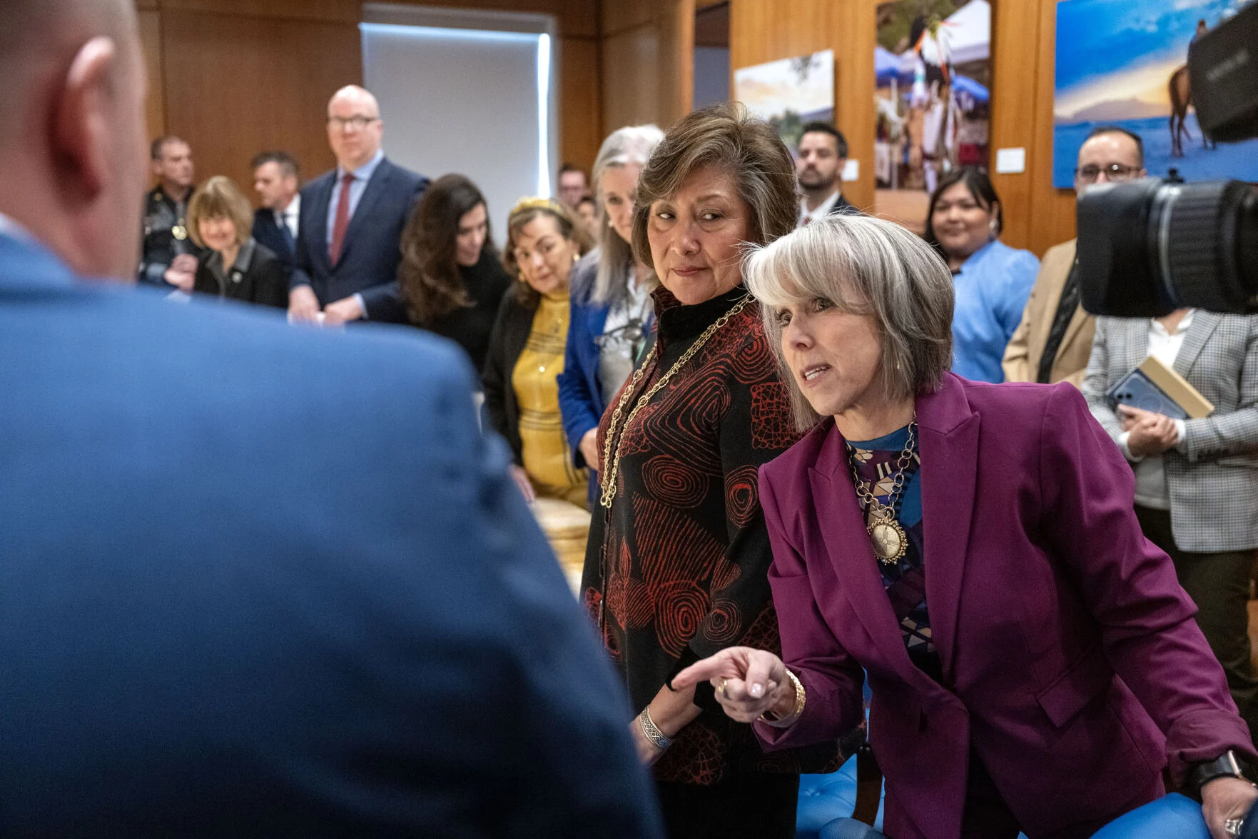 Gov. Michelle Lujan Grisham, top center, joined by state lawmakers, Cabinet secretaries, law enforcement officials and community members, addresses the room before signing public safety and behavioral health bills into law Thursday, Feb. 27, 2025. Photo by Michael G. Seamans/The New Mexican