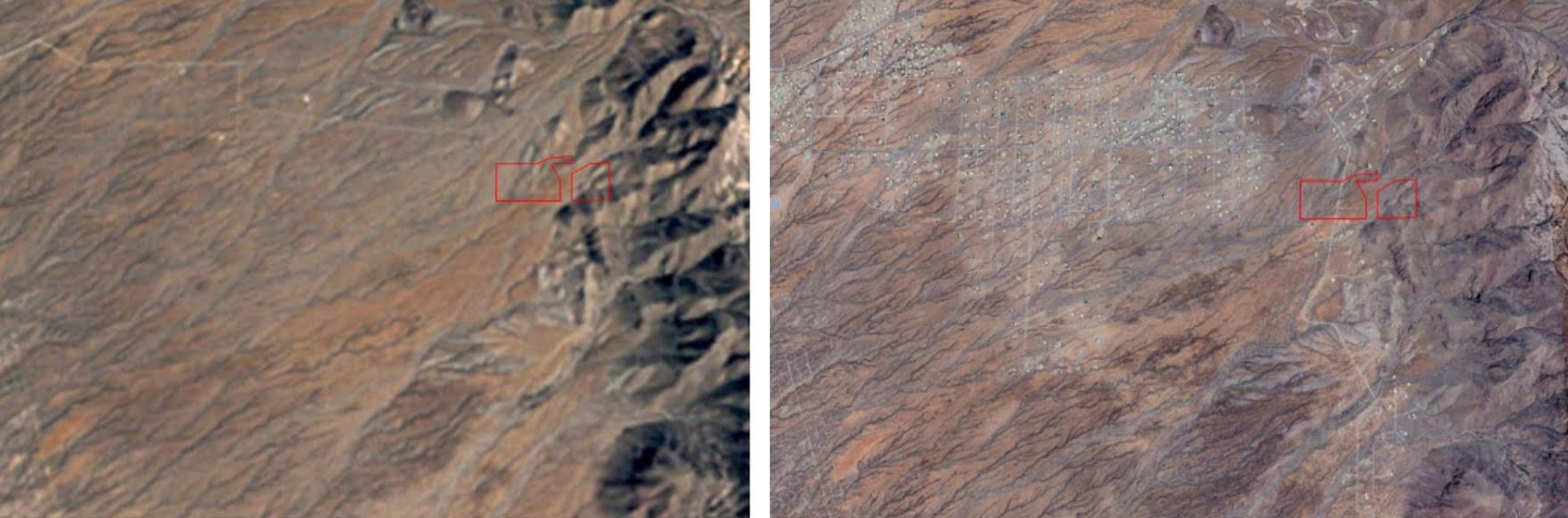 Satellite images from Feb. 1996 and June 2025 showing development surrounding the Achenbach Canyon project (outlined in red). Images from Google Earth