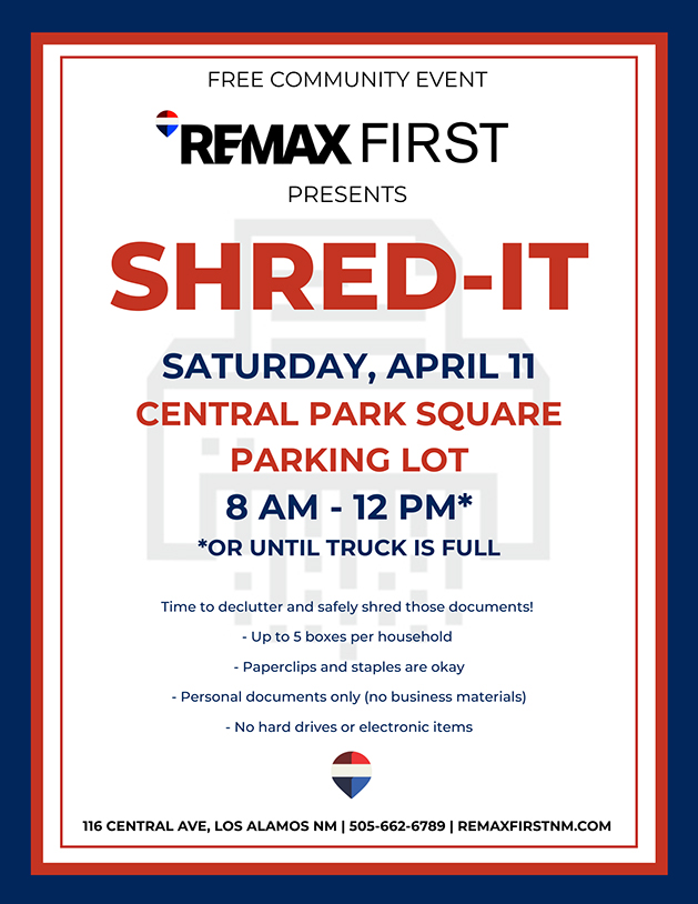 RE/MAX First presents a free community shredding event, “Shred-It” 8 a.m. to noon or until the truck is full, Saturday, April 11, at the Central Park Square Parking Lot in Los Alamos.