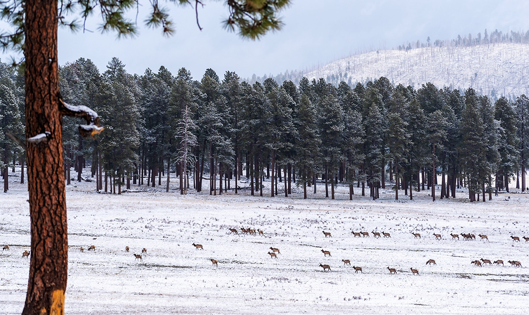 A herd of elk climbing a snowy hill near History Grove at Valles Caldera National Preserve. Registration is now open for the ranger-led Wildlife Photography program at 9 a.m. Sunday, Jan. 5. Registered participants will meet at the Ranger Station, located in the Cabin District approximately 4 miles down the Valles Caldera entrance road. Learn the basics of wildlife photography and compositional recommendations all while exploring Valles Caldera and the Jemez Mountain region. Participants need to bring their own camera for this program. The program duration is 2-5 hours depending on the trail or area visited, with distances of 1-5 miles hiked. This program will occur on the first Sunday of every month. Spots are limited, and registration is required. For more information or to register, visit https://www.nps.gov/planyourvisit/event-details.htm…. Photo by Corey Lycopolus/NPS