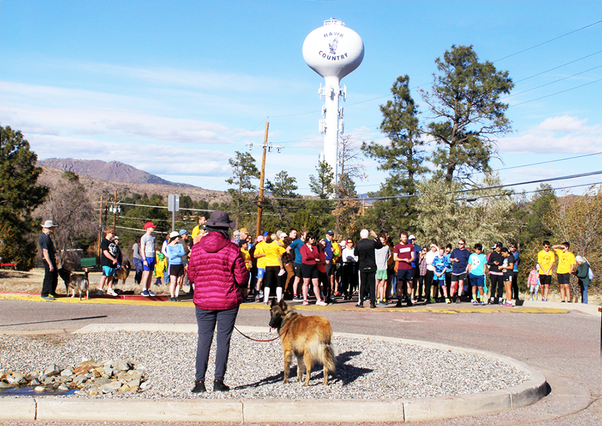 Runners and walkers can take the longer course that goes through the stables or a shorter route that does not. Either way, the 2 p.m. start allows the runners to take off at the front of the pack, and everyone will hear their time when they cross the finish line. Just follow the chalk markings down San Ildefonso Road, turning left to the stables, and then heading back up North Mesa Road, returning to the parking lot at the middle school.