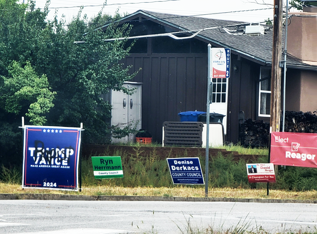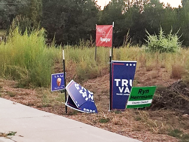 Gary Stradling, Secretary of the Republican Party of Los Alamos told the Post today that last Friday, Sept. 13, he and others erected two 4’ x 4’ political signs for Donald Trump and JD Vance in the designated political sign areas in White Rock – on Sherwood Boulevard across from the Post Office and Smiths and on Rover Boulevard north of the Meadow Lane intersection.