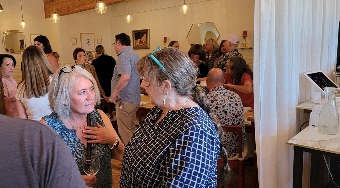 Chamber Director Ryn Herrmann, left, chats with Flowers by Gillian owner Gillian Sutton at the ribbon cutting and menu preview event Wednesday evening at Beef and Leaf Cafe. Photo by Carol A. Clark/ladailypost.com