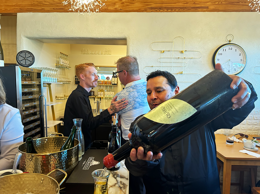 Front of House Manager Ed Leal opens a special bottle of wine to celebrate the opening of Beef and Leaf Cafe following the ribbon cutting Wednesday evening, as Front of House Manager Dustin Lippiatt chats with a guest. Courtesy photo