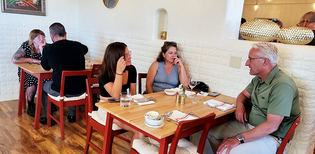 Seated closest to the window Hans Herrmann and his daughter Katie with friends at the ribbon cutting and menu preview at Beef and Leaf Cafe Wednesday evening at 3801 Arkansas Ave. Photo by Carol A. Clark/ladailypost.com