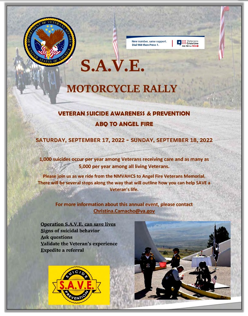 S.A.V.E. Veterans Suicide Awareness & Prevention Motorcycle Rally Albuquerque To Angel Fire Sept. 17-18