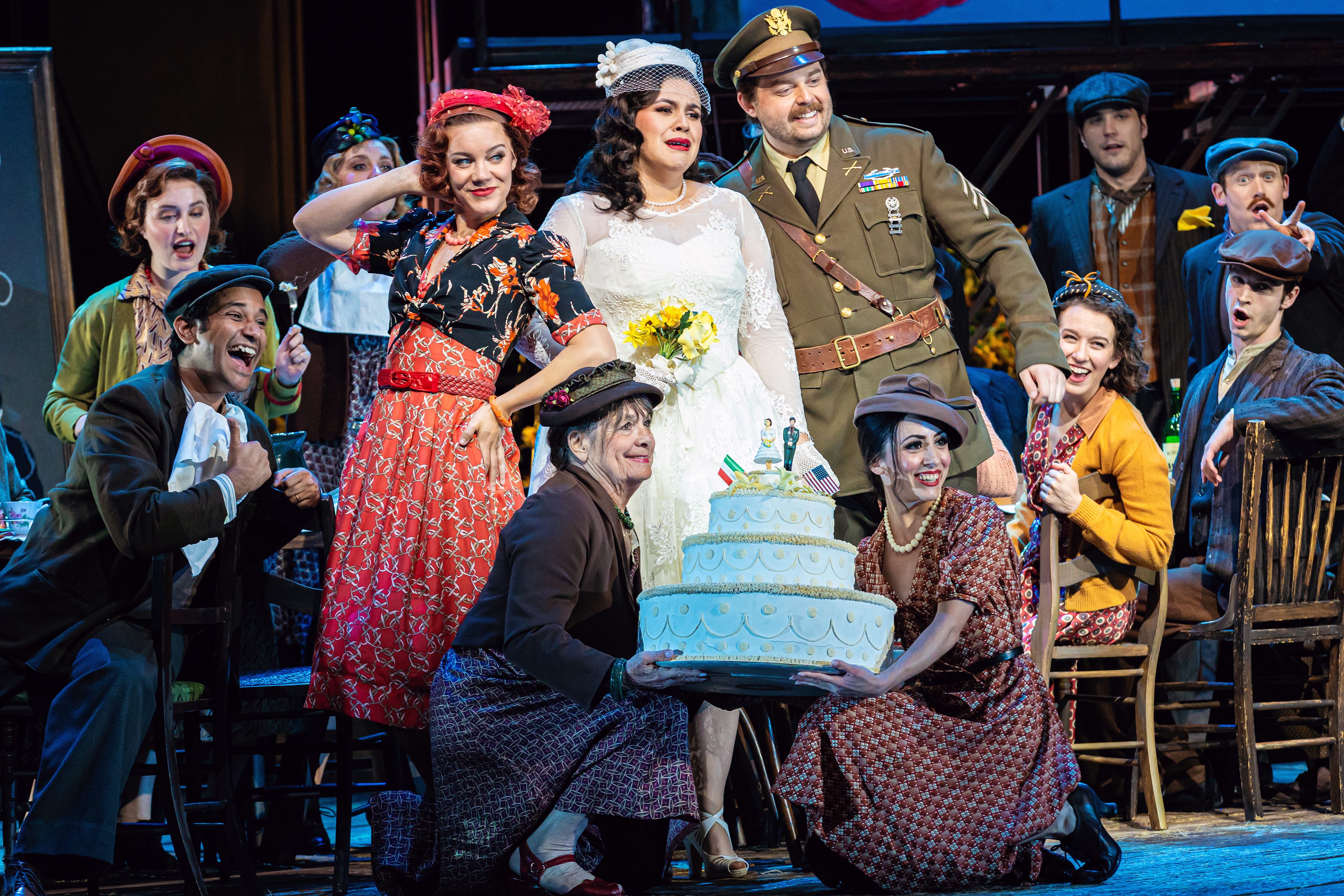 Cadie J. Bryan (Giannetta), Yaritza Véliz (Adina), Luke Sutliff (Belcore), the Santa Fe Opera Chorus, Photo by Curtis Brown for the Santa Fe Opera