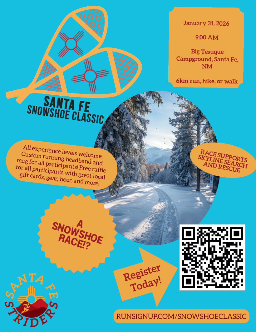 The annual Santa Fe Snowshoe Classic is back! Register at runsignup.com/snowshoeclassic to receive great swag, win prizes, and support Skyline Search and Rescue. The registration fee is $35 (increasing to $40 on January 7th), and proceeds will go to Skyline Search and Rescue. In addition to volunteering at the Snowshoe Classic, Skyline Search and Rescue provides trained teams to participate in wilderness searches for people who are missing, injured, or lost.