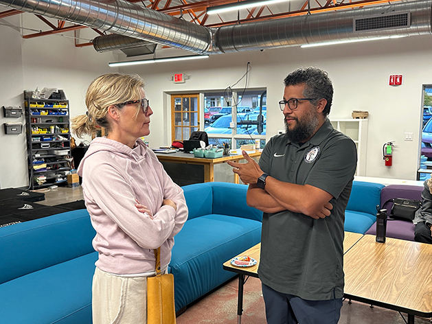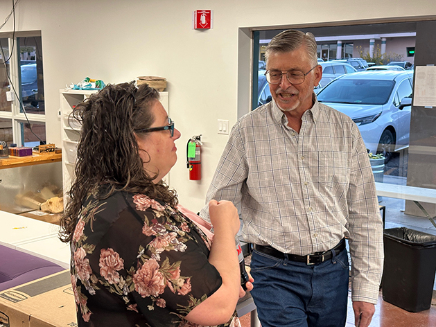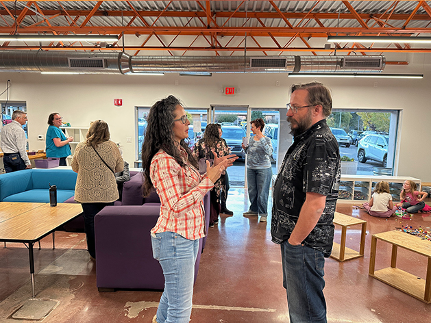 Los Alamos School Board District 1 Candidate Margie Serrato chats with James Dowd during a meet and greet event held Monday night at Los Alamos STEAM Lab in Central Park Square. The event was an opportunity for the public to speak with candidates. Photo by Kirsten Laskey/ladailypost.com