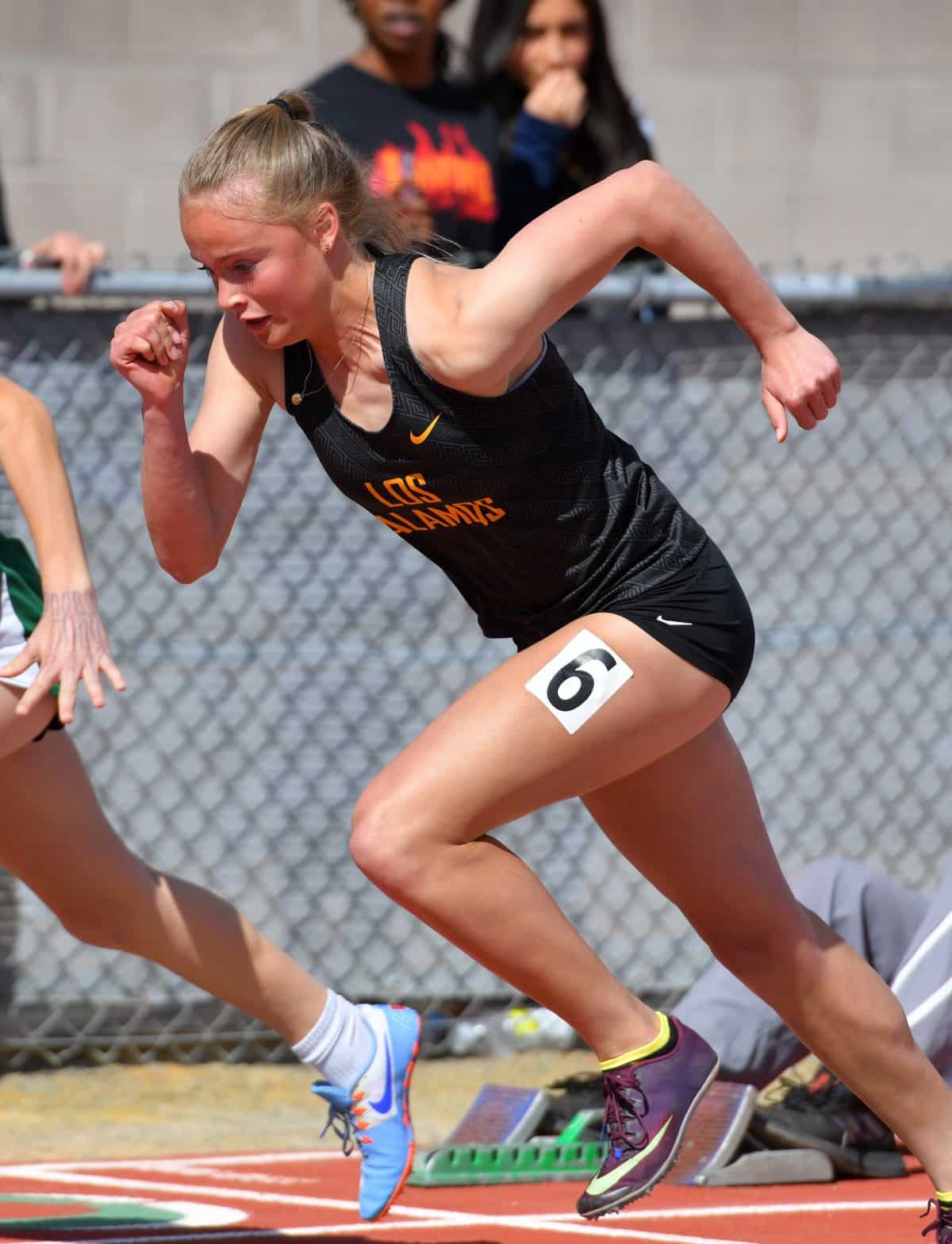 Sophomore Angelina Passalacqua won the 100 m (13.20) and 400 m (61.1), and placed 2nd in the 200 m (27.23) and long jump (17’10”) Friday in the Mark Shumate Invite at Rio Rancho High School. Photo by Blake Wood