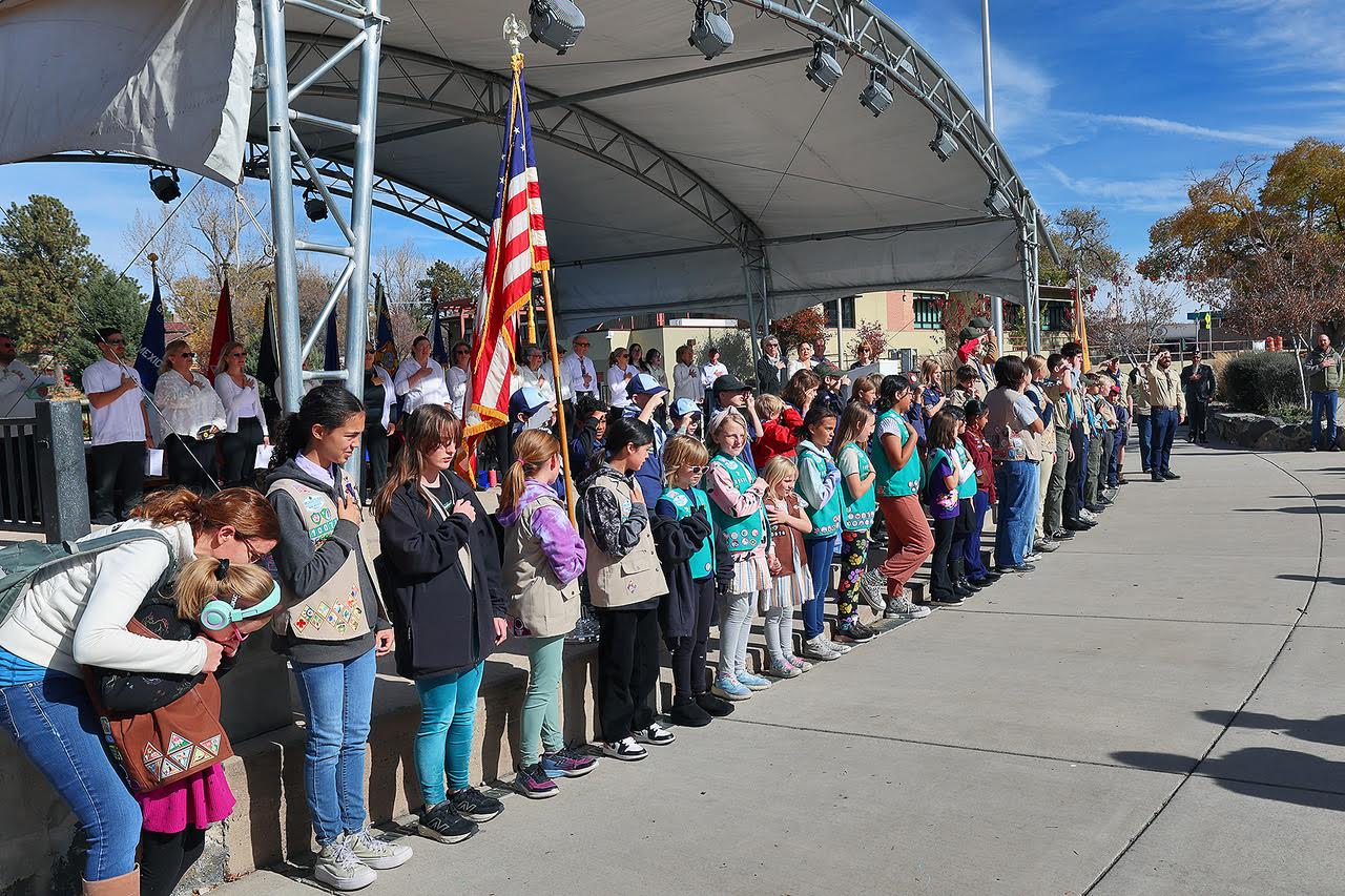 Scouts BSA and Girl Scouts of New Mexico Trails lead the Pledge of Allegiance at the 2025 Veterans Day Ceremony on Tuesday at Ashley Pond Park. Photo by John McHale/ladailypost.com