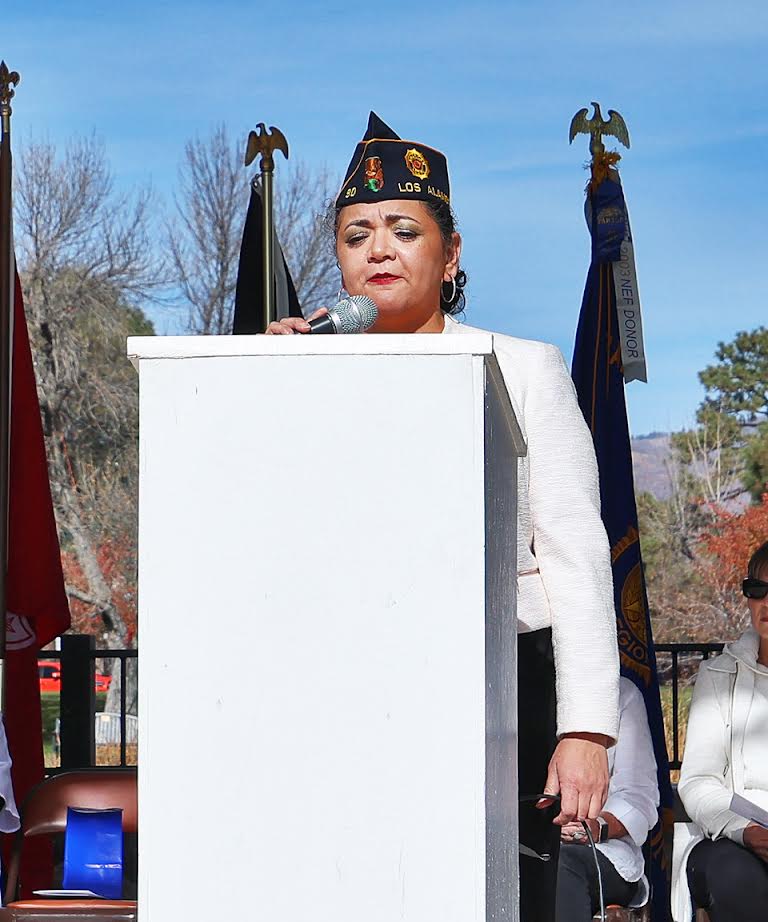 Guest of Honor Elizabeth Escalera, CPT [R] US Navy and US Public Health Service, delivers the Veterans Day address at the ceremony Tuesday at Ashley Pond Park. Photo by John McHale/ladailypost.com