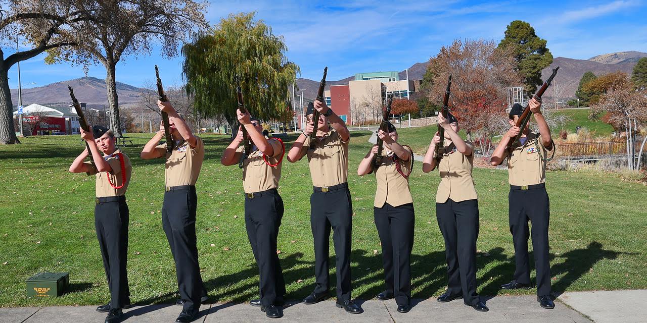 Members of Los Alamos High School’s NJROTC present a Three Volley Salute in honoring the departed at the Veterans Day ceremony Tuesday at Ashley Pond Park. Photo by John McHale/ladailypost.com