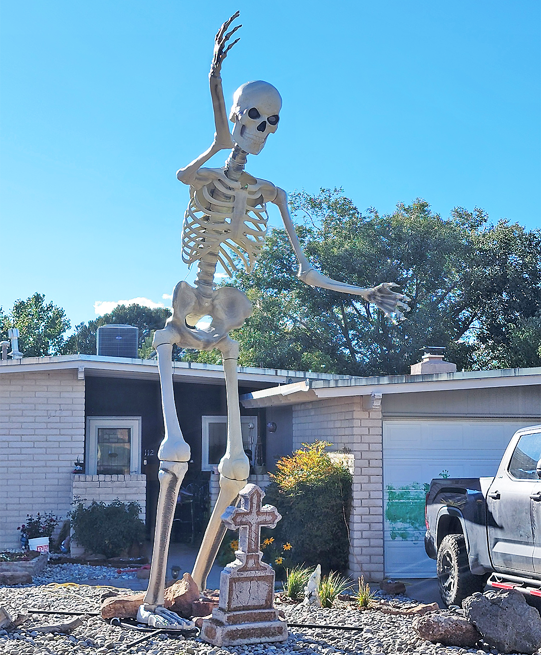 A tall and seemingly friendly skeleton has been spotted waving to passersby lately in front of a home in White Rock. Photo by Carol A. Clark/ladailypost.com