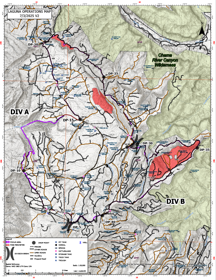 Located in the Coyote Ranger District of the Santa Fe National Forest (SFNF), 8 miles north of N.M. 96 and west of the Chama River Canyon Wilderness, the lightning-caused Laguna Wildfire remains at 1,300 acres burned and 12 percent contained.
