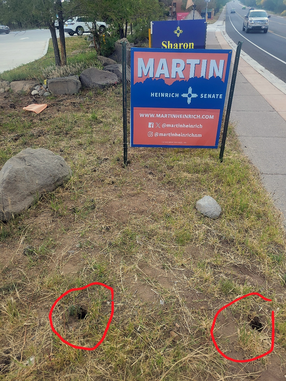 The Trump sign that was defaced Sept. 20, was stolen on the evening of Sept. 21, along with the posts (post holes outlined here) and removed from the premises on Trinity Drive. Courtesy/RPLA