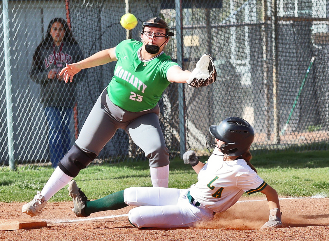 Ezri Roybal slides in safely under the tag of Danika Davenport in the 4th inning of the conference game hosted by the Los Alamos High School Hilltoppers softball team against the Moriarty Pintos, played Wednesday at Hope Field in White Rock. The Toppers led the entire game and had a big 5th inning to run the score up to 14-4 for the win, which makes their record 4-0 for district play and 10-5 overall. The Toppers’ next game is today, April 17, in Taos. Photo by John McHale/ladailypost.com