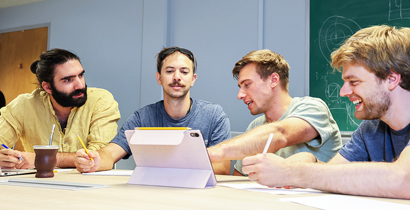 From left, Los Alamos mentors Paolo Braccia and Martin Larocca talk to students Roy Forestano and Maximilian Krahn. Courtesy/LANL