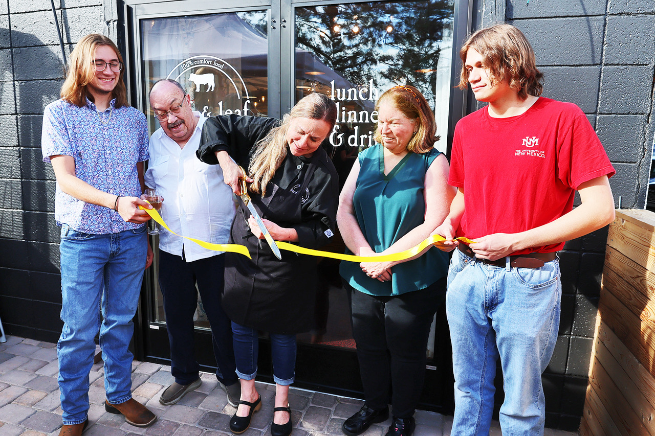 Celebrating the first anniversary of Beef & Leaf Cafe with a ribbon cutting Thursday, from left, Owner Laura Crucet’s son William Hamilton, her father Fernando Crucet, Owner/Executive Chef Laura Crucet, Los Alamos Chamber of Commerce Director Sandy Jones and Crucet’s son Julian Hamilton, at 3801 Arkansas Ave. Suite G. Photo by John McHale/ladailypost.com