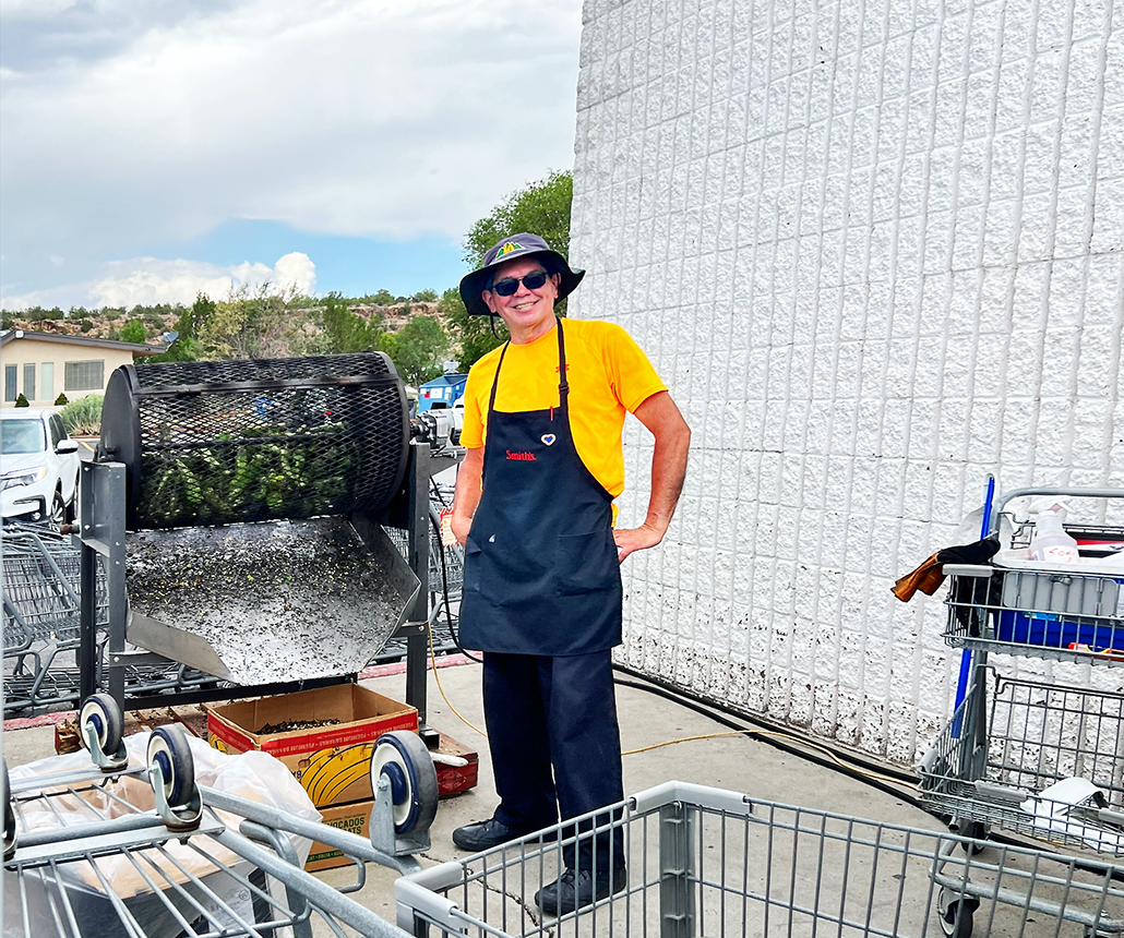 Tony the chili roaster was on the job today, filling the air with that distinctive aroma of Hatch roasted chilis outside Smith’s at 31 Sherwood Blvd. in White Rock. Hatch chilis are special due to their unique flavor and growing conditions in the Hatch Valley of New Mexico. The combination of high altitude, rich volcanic soil, and a distinctive climate contributes to their earthy, buttery, and smoky flavor. This flavor profile, combined with the tradition of roasting them, makes Hatch chilis a sought-after ingredient, particularly during their late summer harvest season. Photo by Margaret
