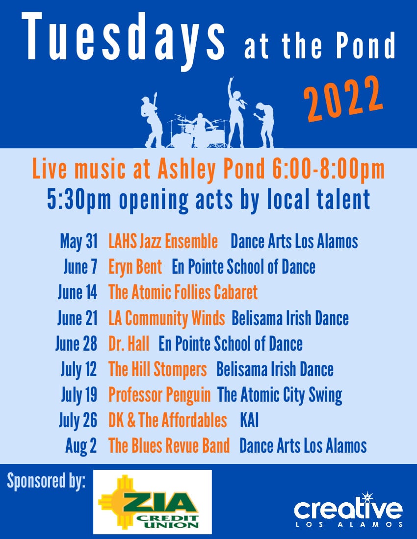Los Alamos Creative District will kick-off Tuesdays at the Pond Summer Performance series tonight with the LAHS Jazz Ensemble and DALA.