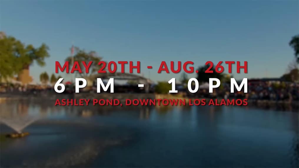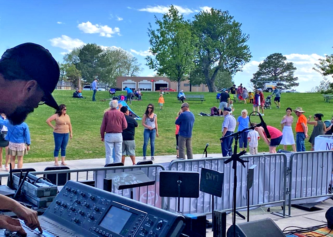 Community members are gathered for Salsa and Cumbia lessons in front of the stage ahead of this evening’s first summer concert of the season at Ashley Pond Park. The Los Alamos Middle School Band performs next followed by opening band Concepto Tambor and at 8 p.m. headliner Nosotros takes the stage. Photo by Ryn Herrmann