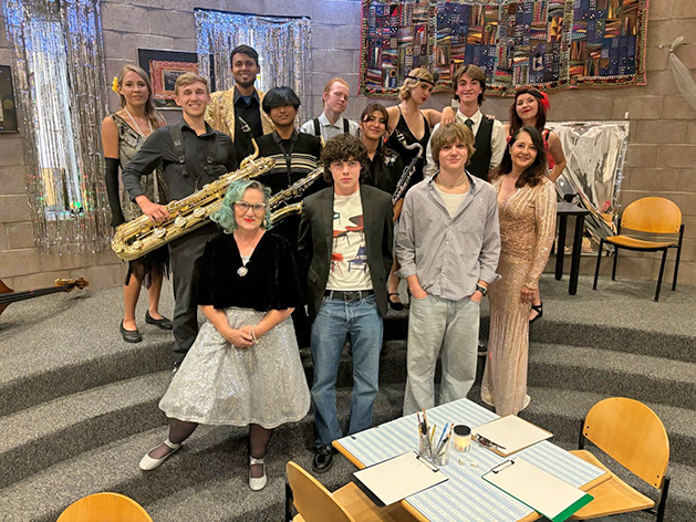 The models for the life drawing session and Quemazon Combo musicians gather together Saturday afternoon. Courtesy/Mesa Public Library Read More