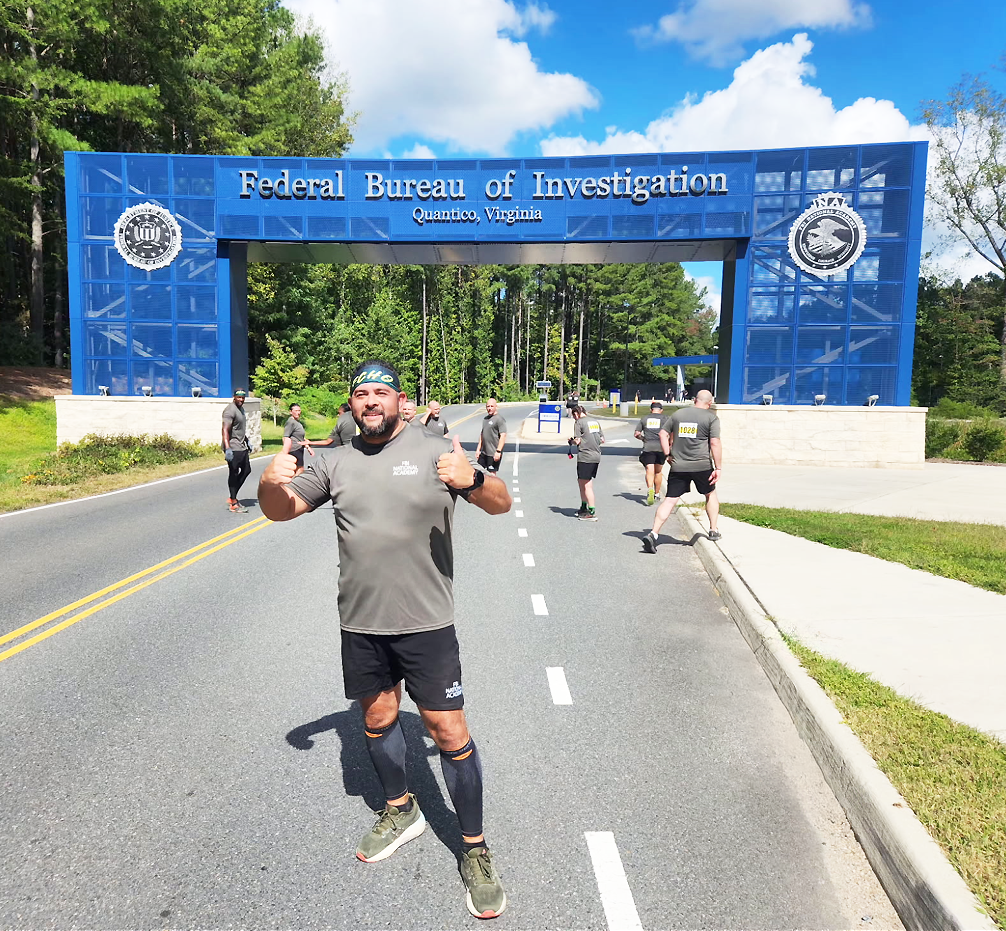 Deputy Chief James Rodriguez finishes the legendary Yellow Brick Road, entering the FBI Training Facility under the blue gate. Courtesy/LAPD