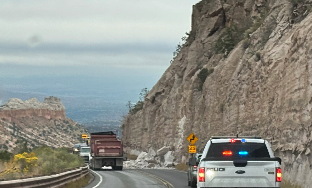 UPDATE: Road is cleared and traffic is moving smoothly. The Los Alamos Police Department has closed one lane on the Main Hill Road this morning for an undisclosed amount of time due to a rockslide. Officers are allowing commuters to use one lane and directing traffic around the rockslide located near Anderson Lookout. Commuters are encouraged to seek an alternate route and to expect delays. Photo by Mary Arrowsmith