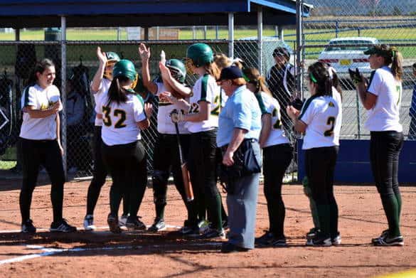 Micaela Christensen congratulated at home plate after home run hit. Photo by Alan Kirk
