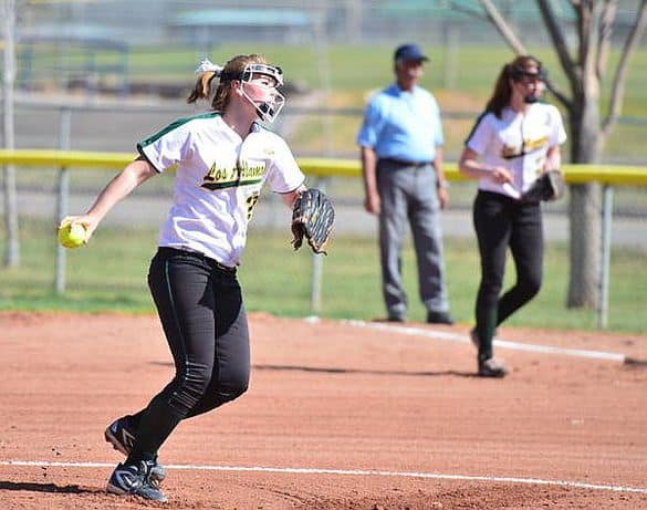 Monica Teter picthing on her way to striking out 17 batters. Photo by Alan Kirk