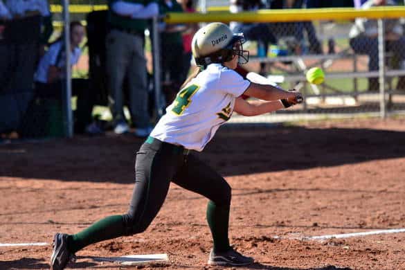 Alyssa Mojica gets one of her two hits driving in three runs. Photo by Alan Kirk