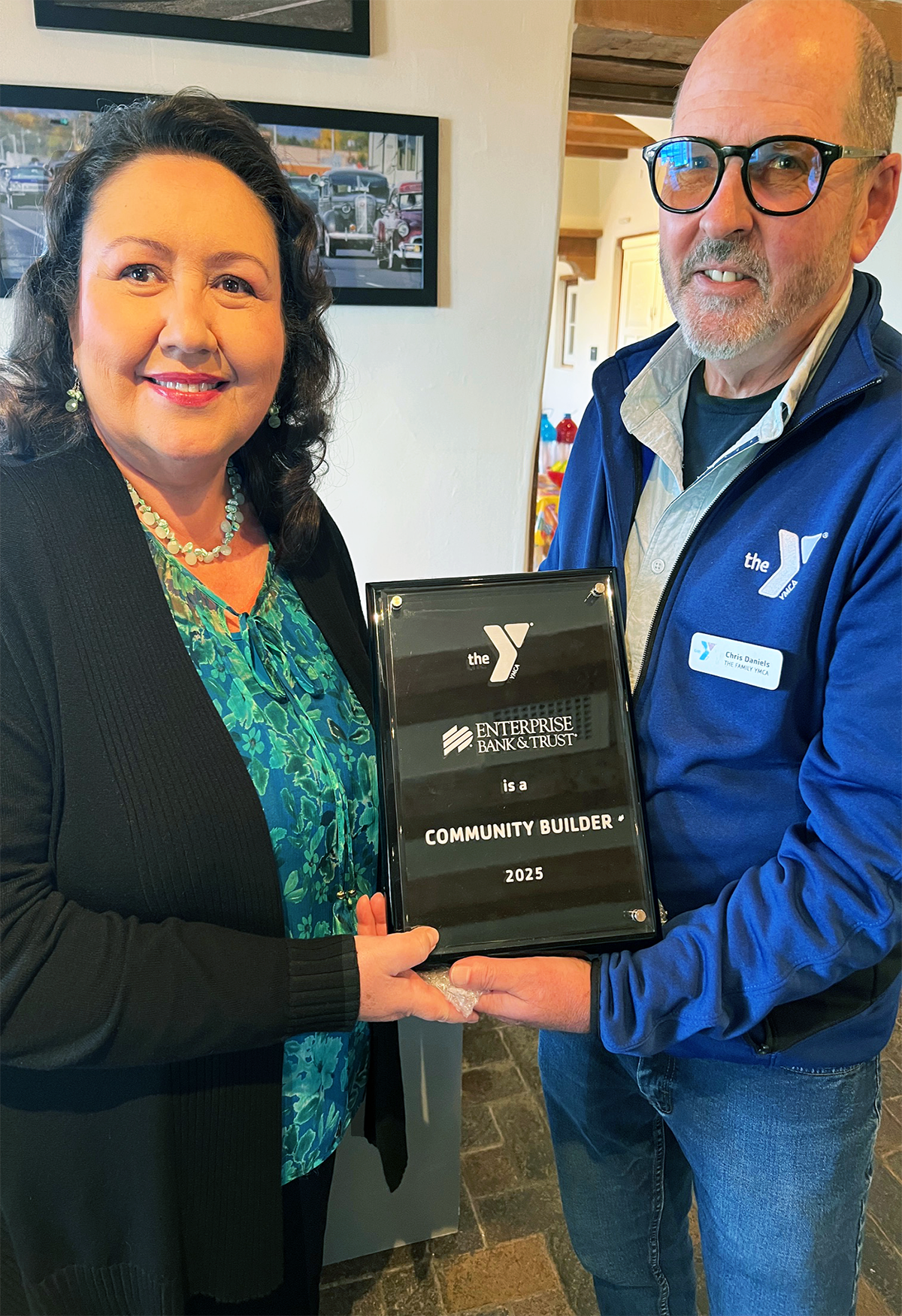 Enterprise Bank & Trust President – Los Alamos Region & Director of Community Engagement Liddie Martinez, receives the 2025 Community Builder Award from The Family YMCA CEO Chris Daniels. Daniels presented the award in appreciation for the significant investment in the Lowrider Art Program from Enterprise Bank & Trust of Los Alamos, which teaches local youth to modify RC cars, study electric and nitro power systems, and apply math and physics. Photo by Donavan Price