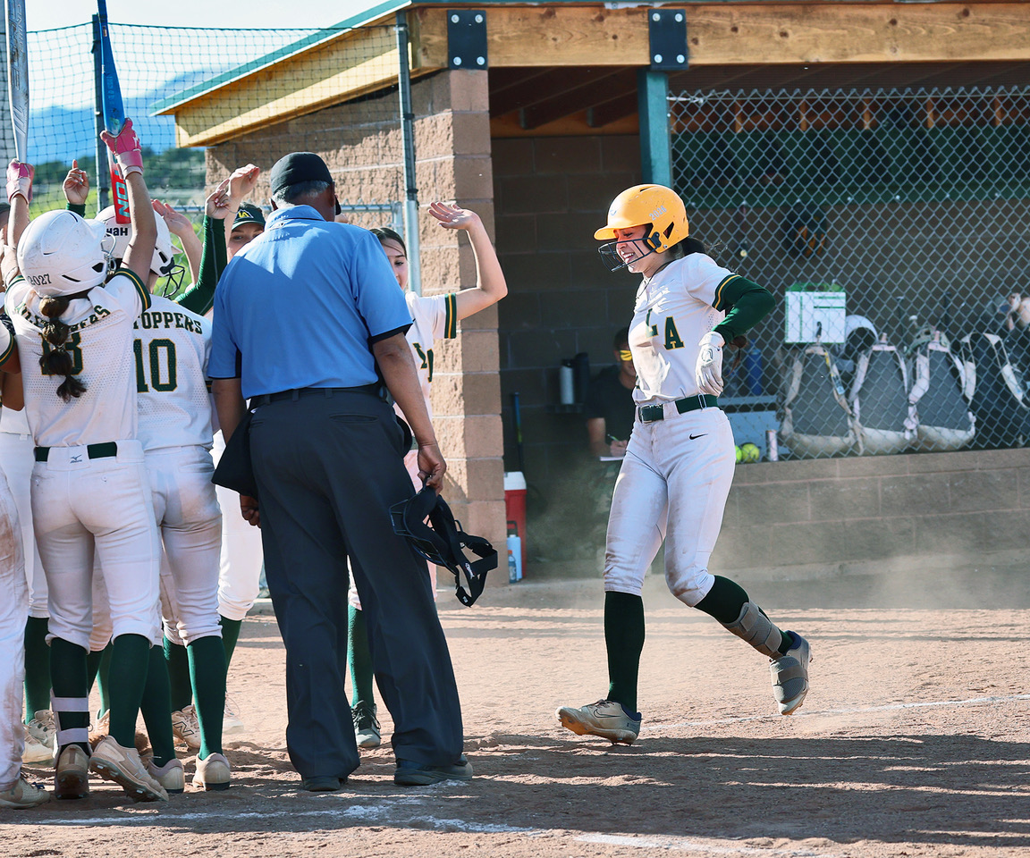 Abagail DeHerrera trots toward the waiting team to celebrate her home run in the 6th inning. Photo by John McHale/ladailypost.com