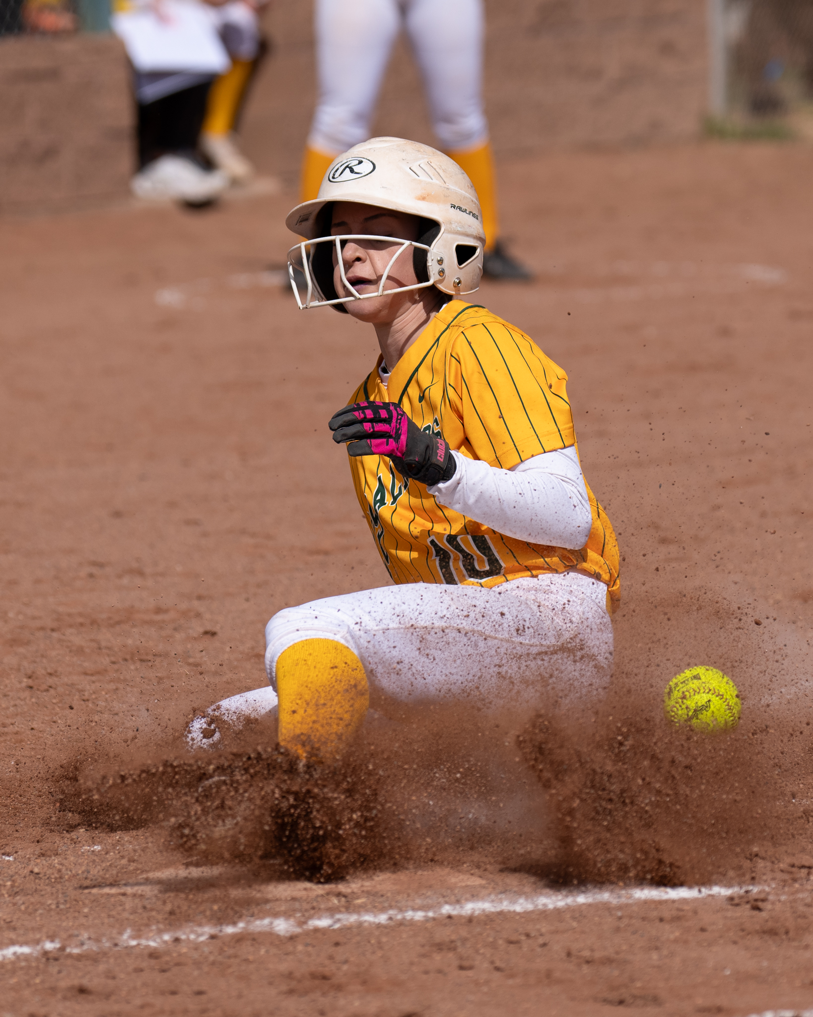 Sydney Kitts slides into home plate safe. Photo by Nate Limback/ladailypost.com
