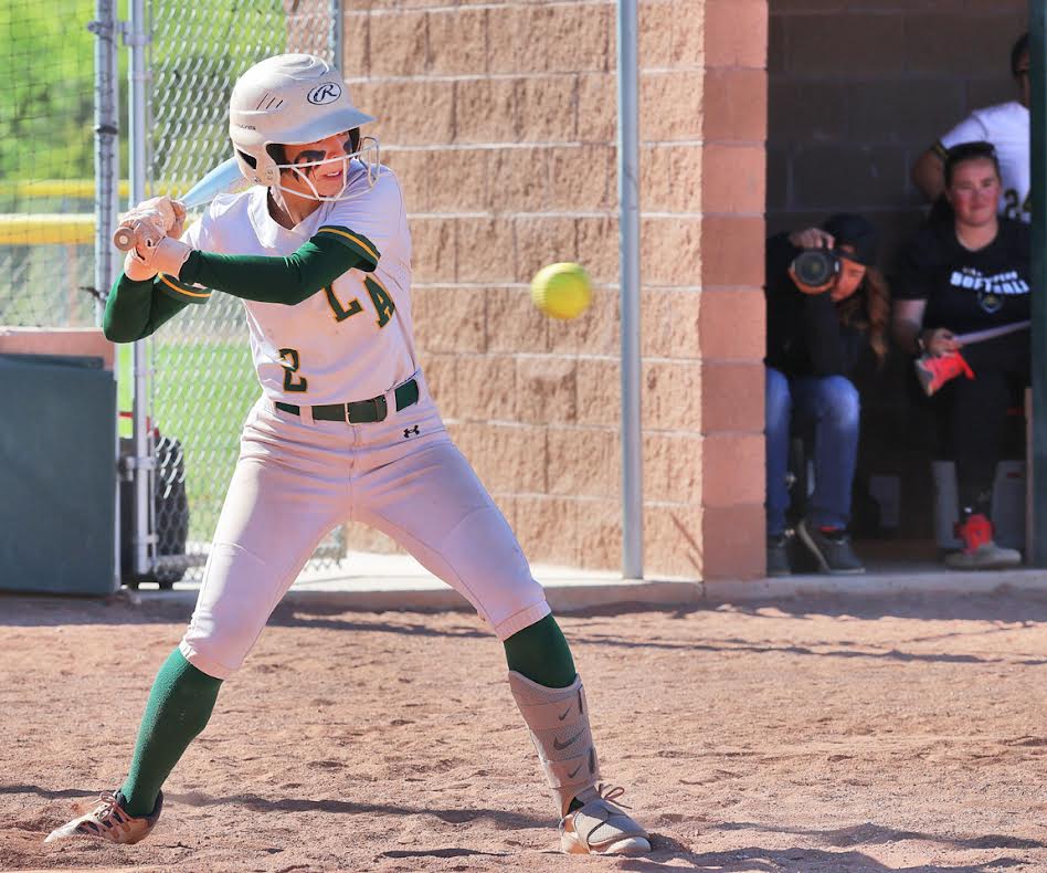 Abagail Deherrera eyes the ball before hitting it for a single and driving in an RBI in the 1st inning. Photo by John McHale/ladailypost.com