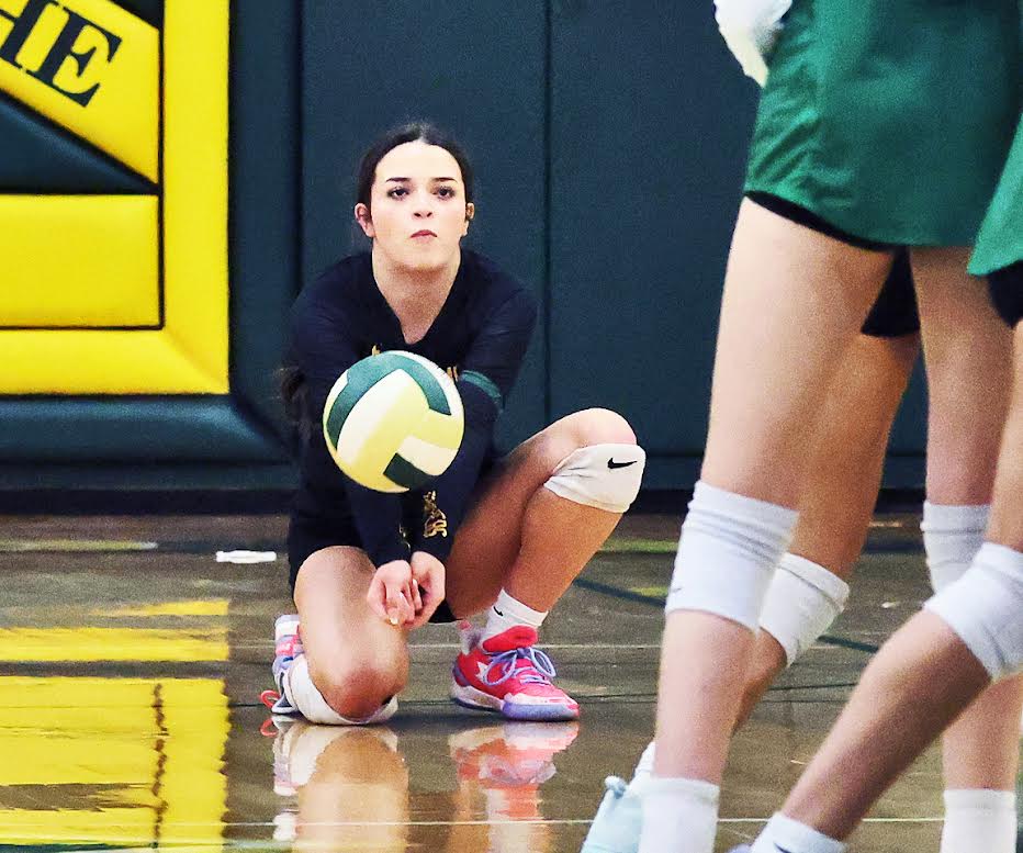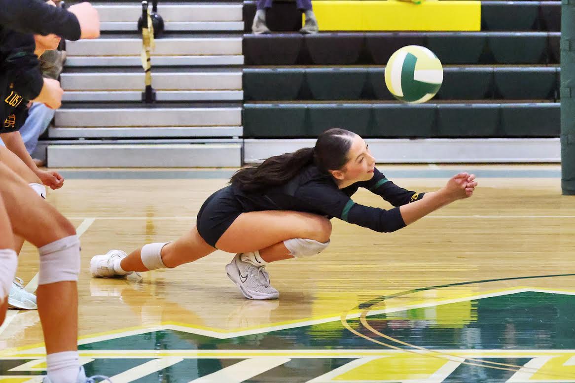 Maya Graves makes a diving save of this serve in the second set. Photo by John McHale/ladailypost.com