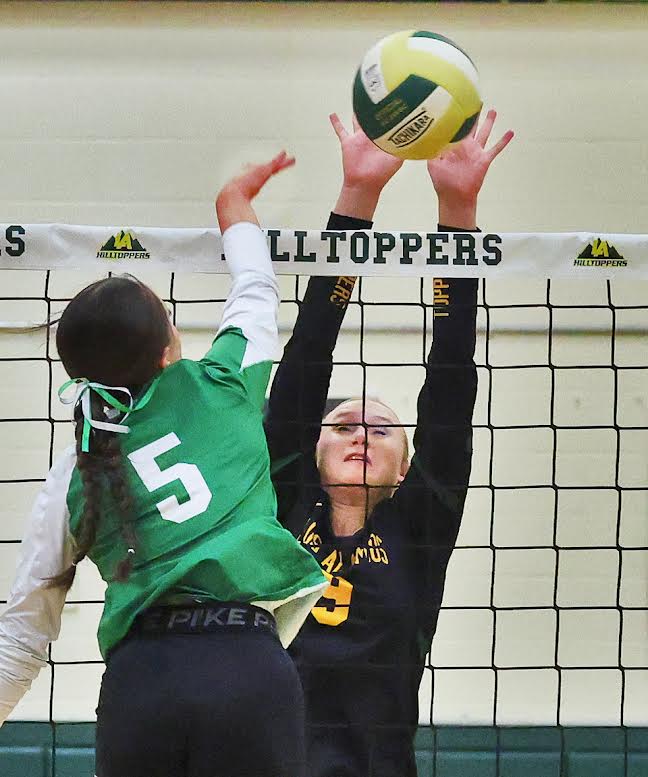 Allie Jackson blocks a spike attempt by Alexiyah Lopez in the first set. Photo by John McHale/ladailypost.com