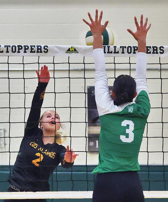 Raina Passalacqua spikes the ball at Jamie Martinez in the first set. Photo by John McHale/ladailypost.com