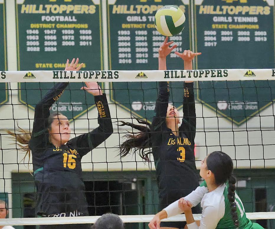 Peyton Ladonty and Maya Graves go up for the block from a spike attempt by Vania Gutierrez in the first set. Photo by John McHale/ladailypost.com