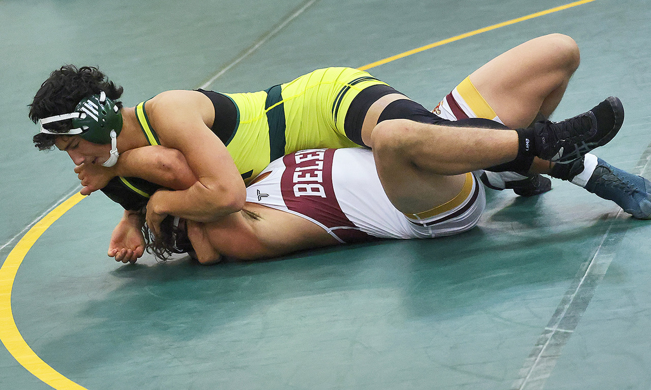Topper Brailyn Manzanares wrestles in the 144-pound weight class and wins his match by a pin on Tuesday afternoon when the Los Alamos High School Hilltoppers Wrestling Team hosted the Belen Eagles in a wrestling match in Griffith Gymnasium. The Eagles proved to be a strong team beating the Toppers 40-25. Photo by John McHale/ladailypost.com