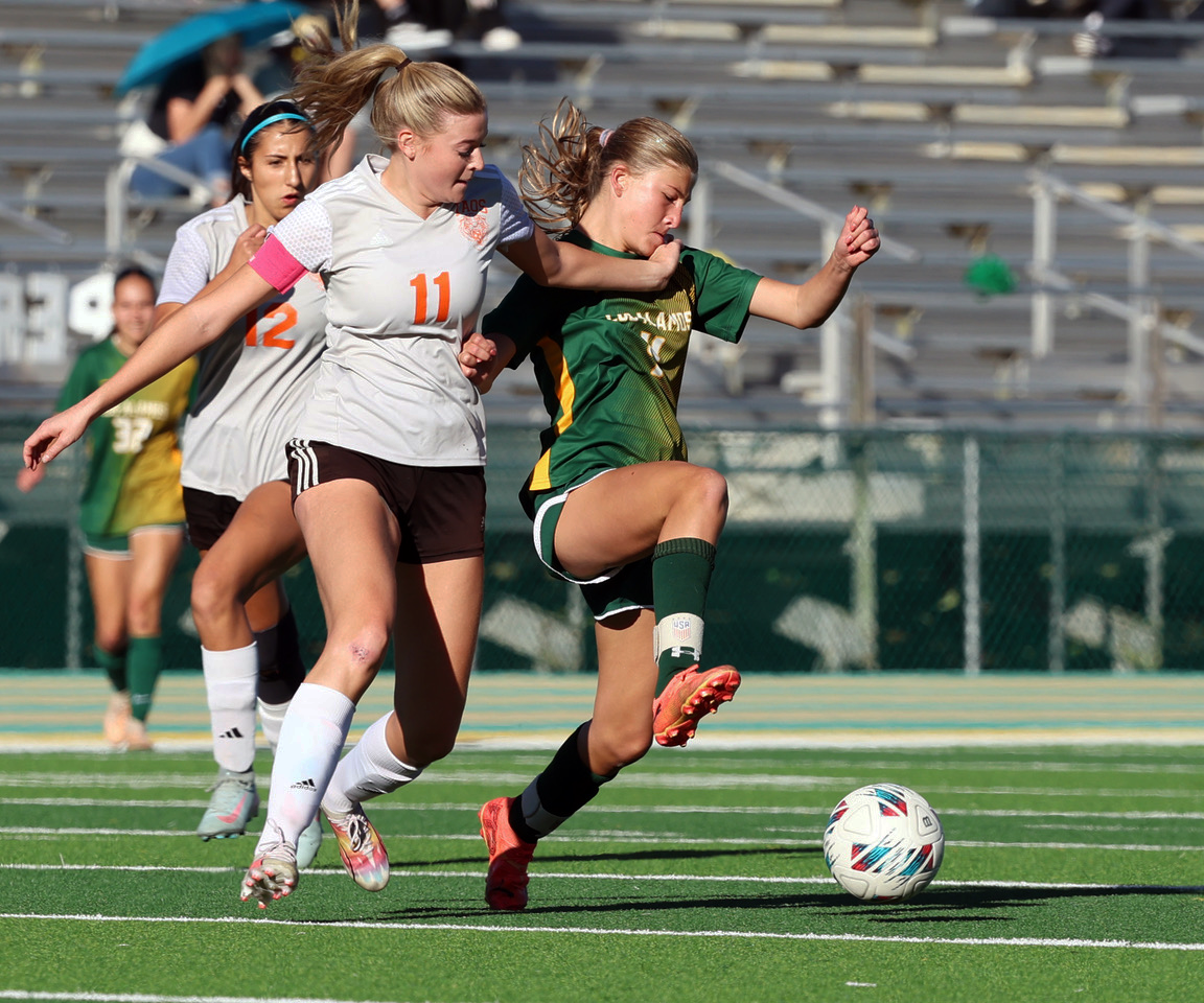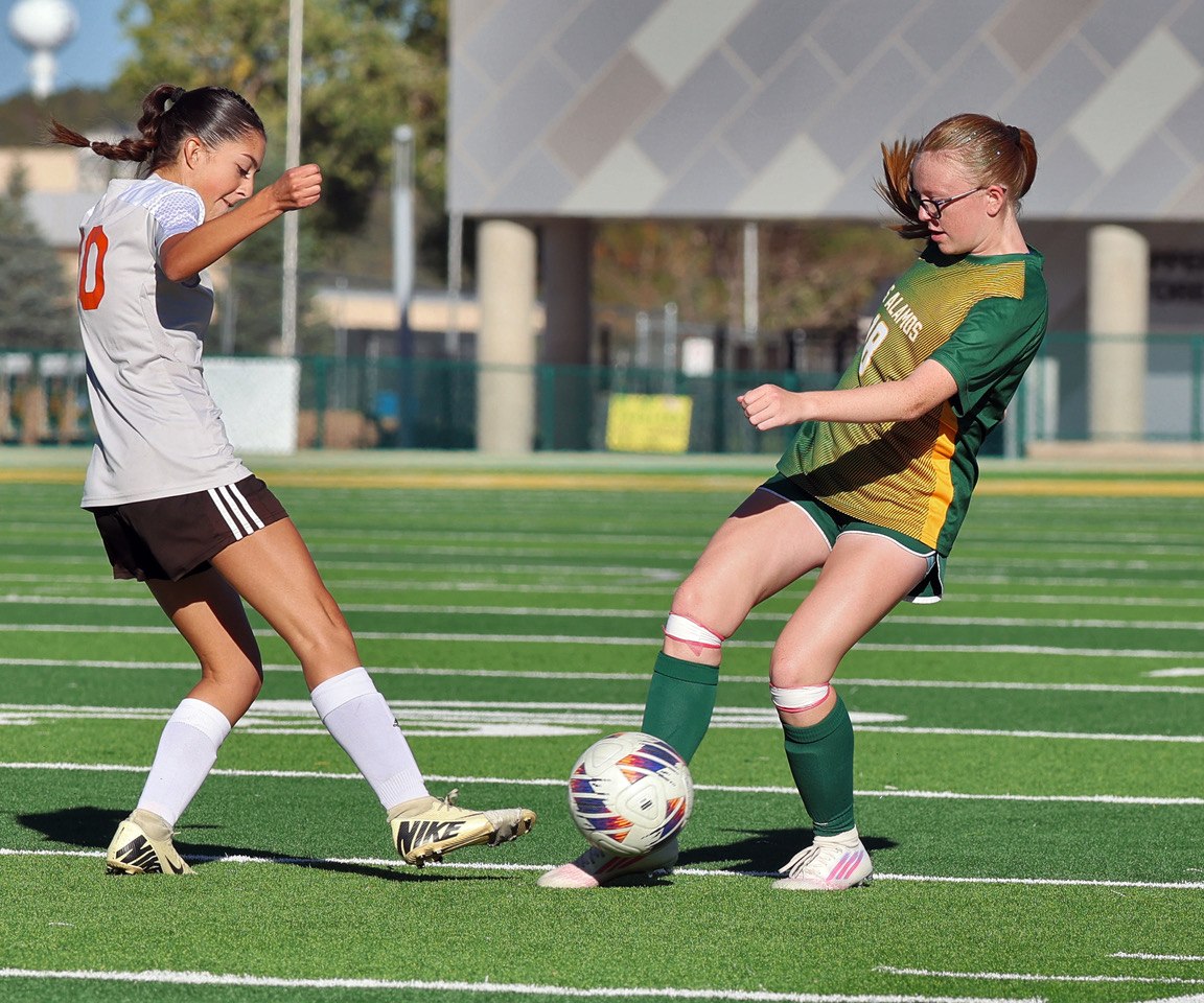 Payton Sutherland battles Amaya Struck for the ball in the first half. Photo John McHale/ladailypost.com