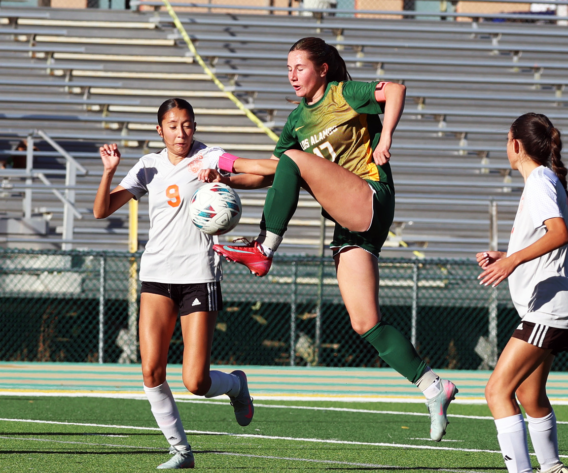The Los Alamos High School Hilltopper Girls Soccer Team won a conference match against the Taos Tigers Tuesday afternoon on Sullivan Field. Here Dayja Fellers takes a shot and scores in the first half. Scoring for the Toppers in the match, Gracie Haagenstad had 2, Dayja Fellers 1 and Margaret Steinkamp 2. The Tigers are always a strong team, but the Topper defense held them scoreless in Tuesday’s match. This win brings the Topper record to 12-6-1. Photo by John McHale/ladailypost.com