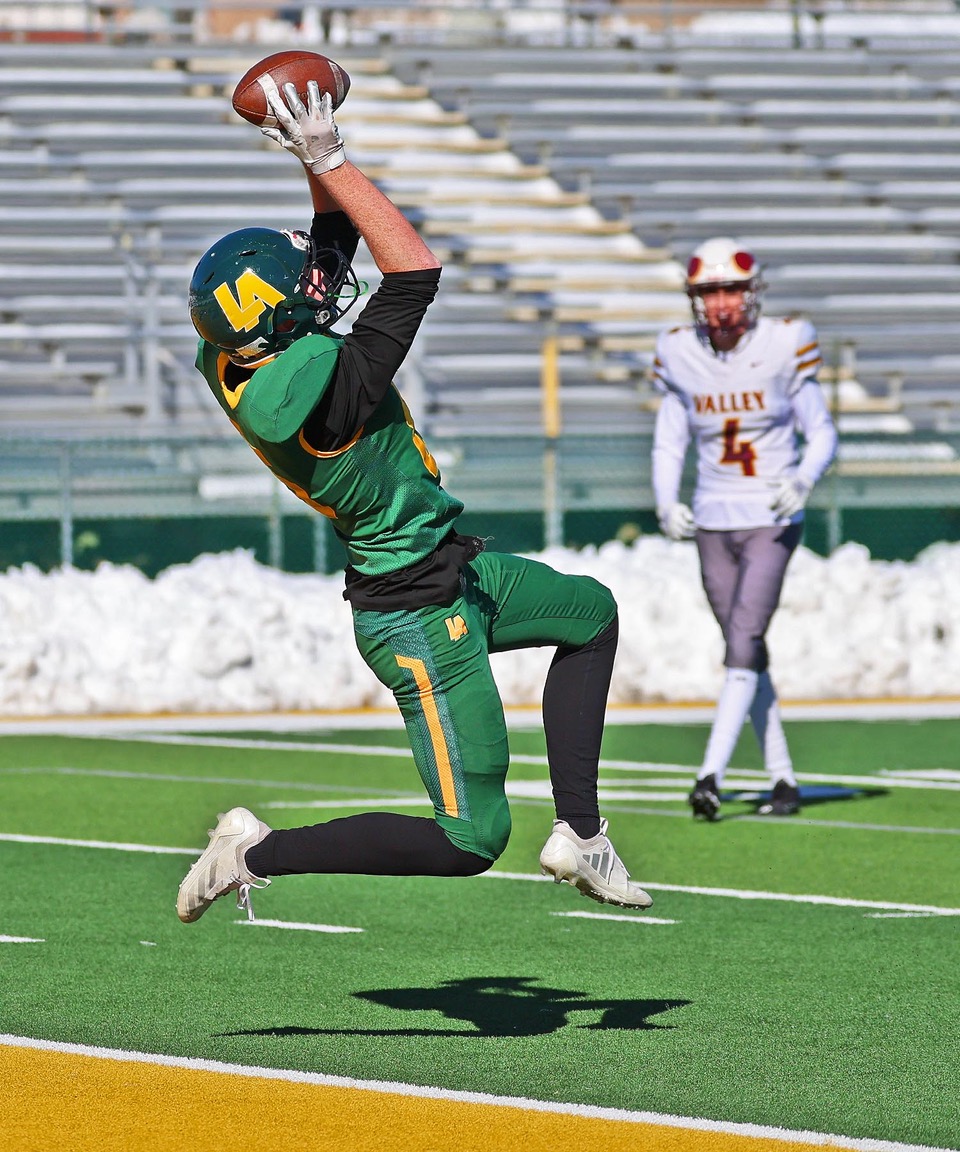 Gavin Mitchell catches a pass from quarterback Kyle Evenhus for a touchdown in the second quarter. Photo by John McHaleladailypost.com