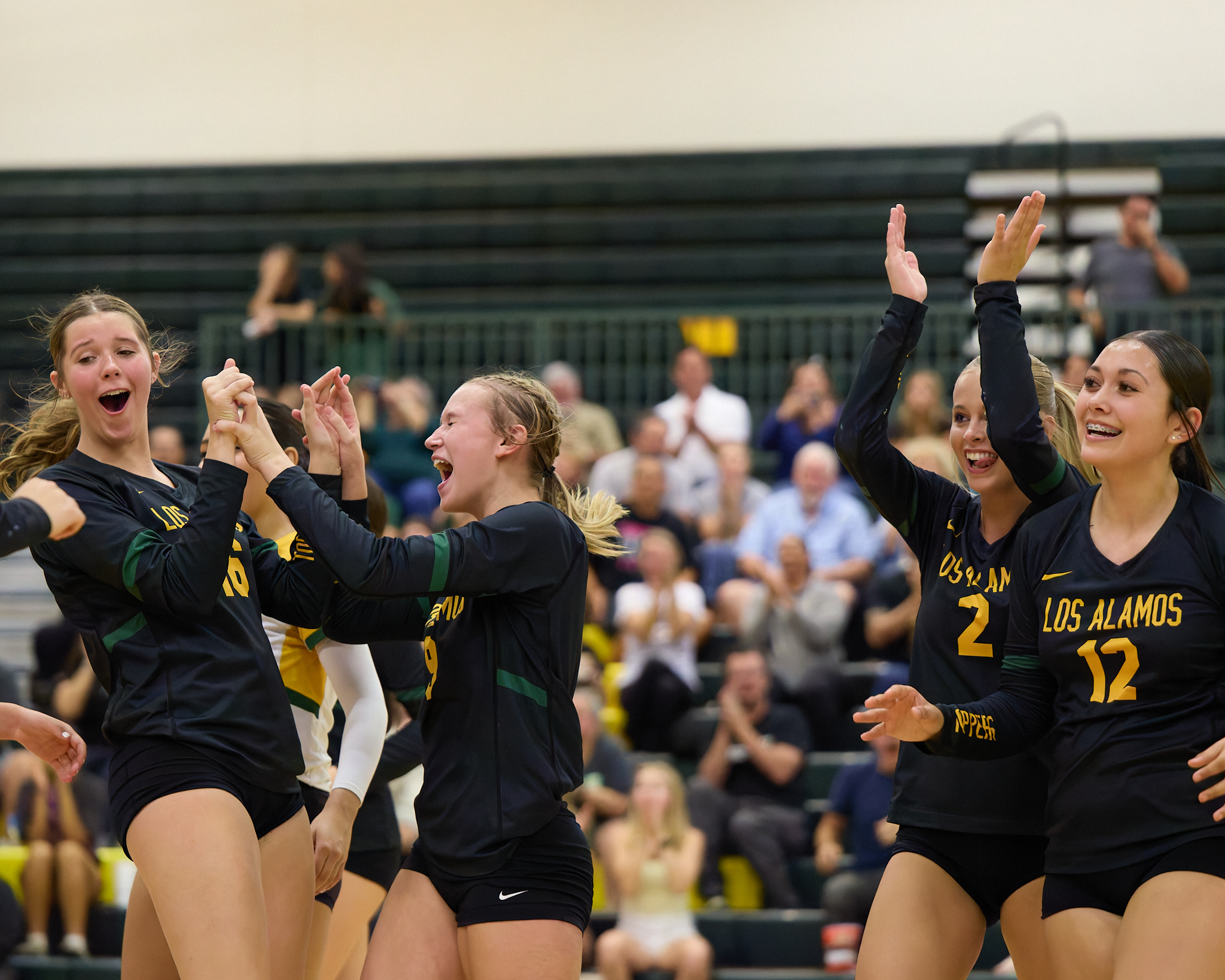 The Toppers celebrate after their set one win. Photo by Nate Limback/ladailypost.com