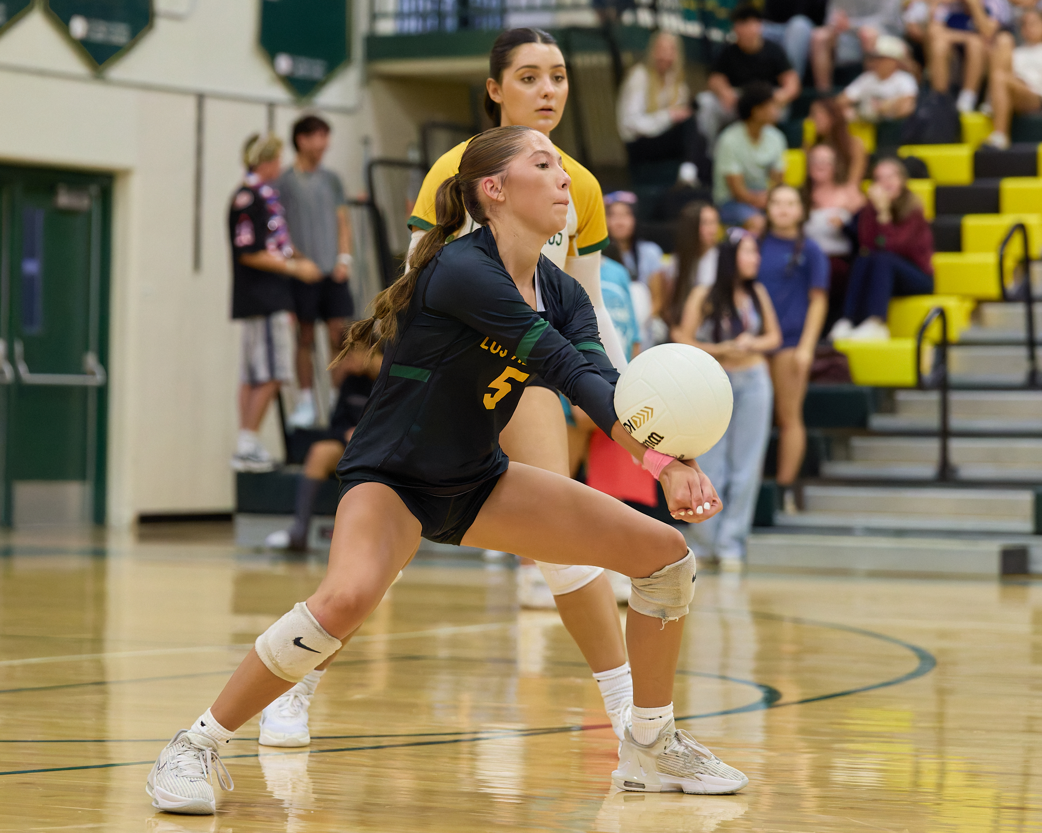 Sierra Gonzales playing in the Libero position digs a serve in the first set. Photo by John McHale/ladailypost.com