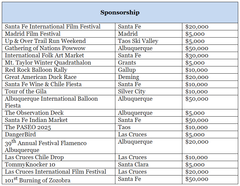 This program offers three options of support. The first option is an event accelerator that helps tourism events level up through technical support and strategic planning. The second option is a cooperative marketing model that pools resources between NMTD and participating entities. The third option is sponsorship support for established tourism events. For FY26, 14 events will be participating in the accelerator, 10 will be participating in the marketing cooperative and 20 will be participating in the sponsorship module.